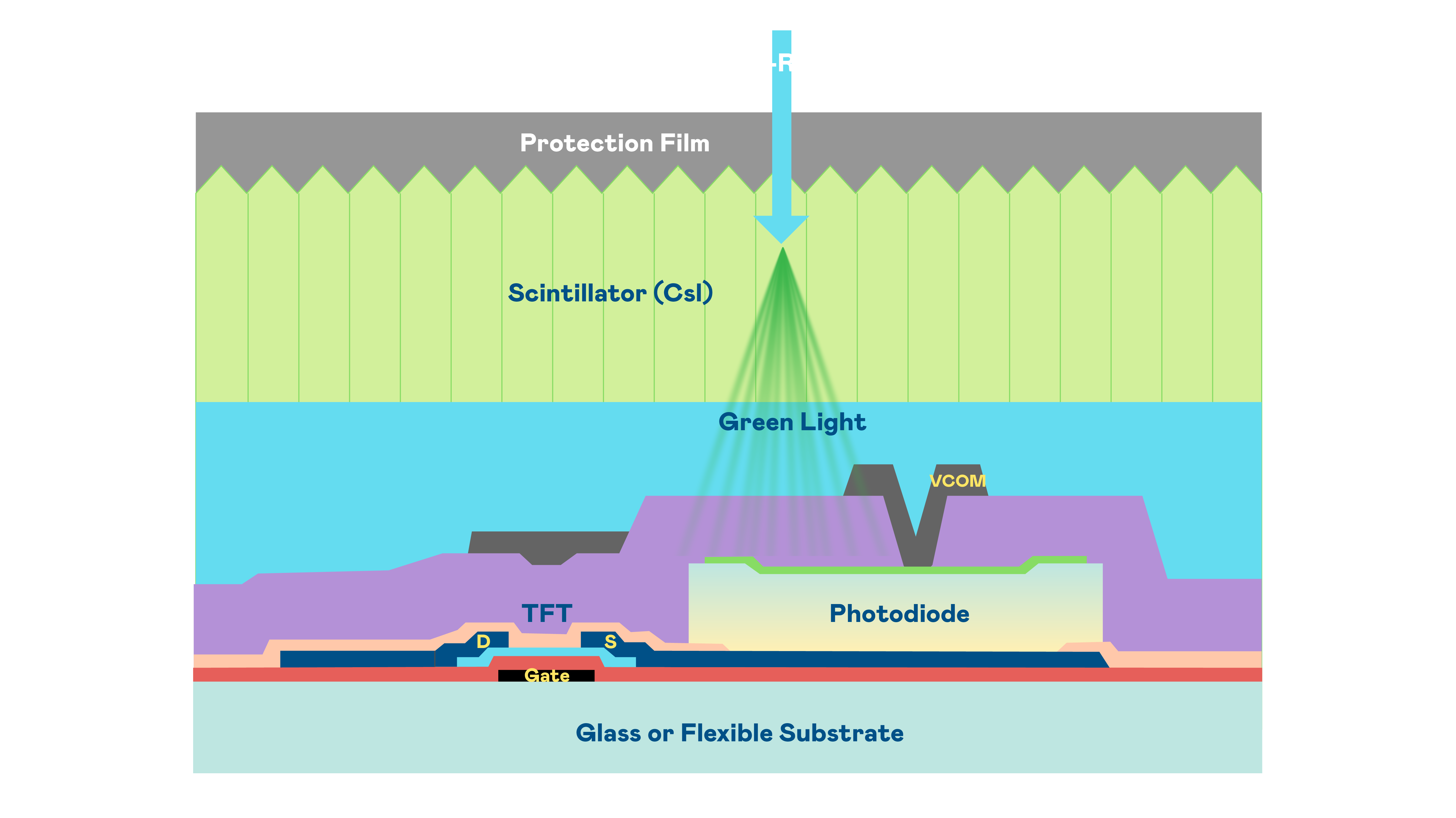 利来国际的X光影像感测阵列使用薄膜电晶体 (TFT) 作为每个像素的读取开关,搭配光电二极体(Photodiode)的光电转换元件,用以感测X光影像讯号。